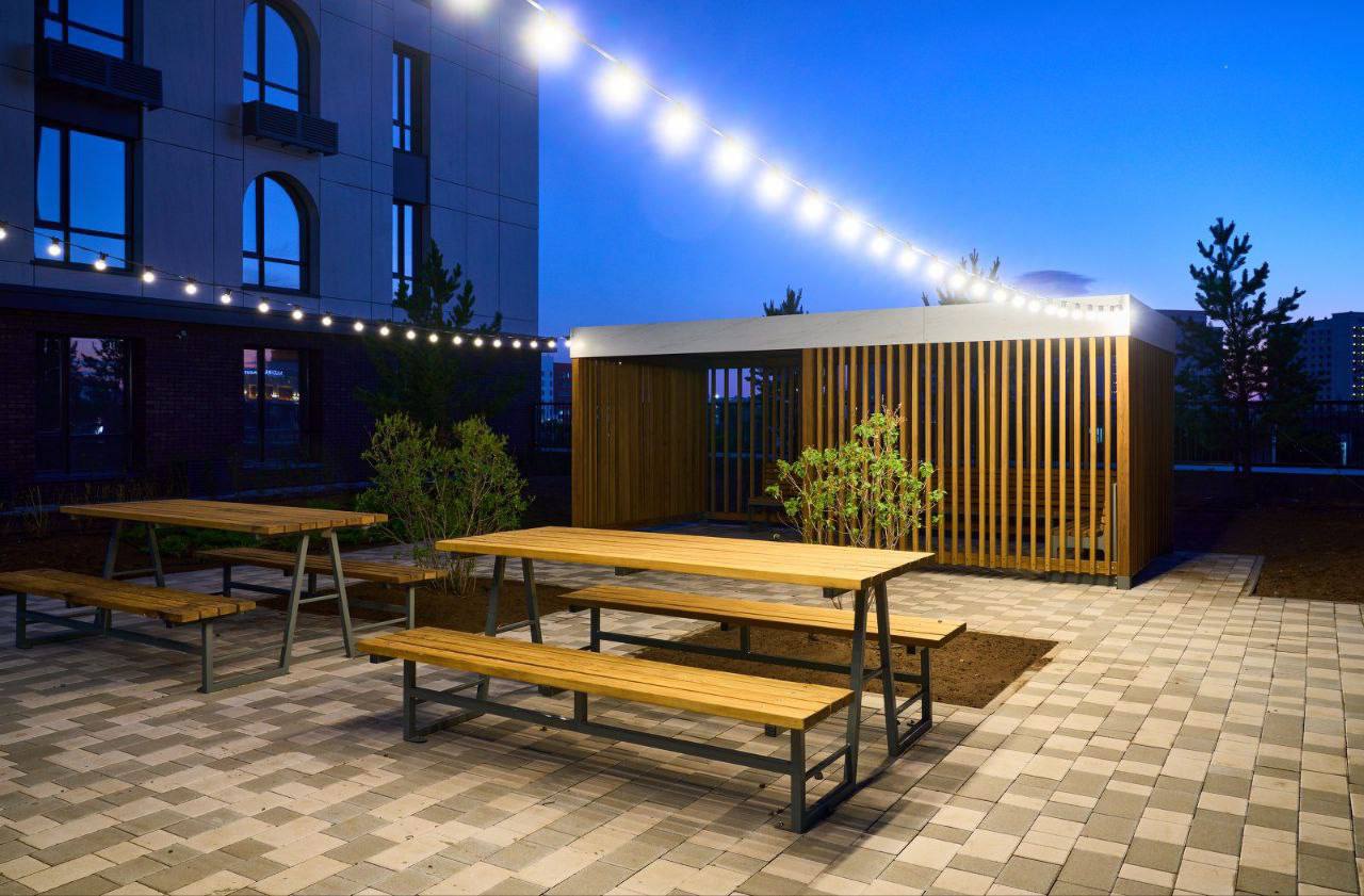 Территория комплекса закрыта и охраняется круглосуточно, обеспечивая безопасность и комфорт для жителей. Во дворе расположены детские и спортивные площадки, зоны отдыха с беседками и лавочками, а также дорожки с качественным покрытием. Для удобства жильцов предусмотрены подземный паркинг, колясочные и видеонаблюдение.